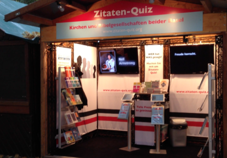 Mit i-Pad's und Bildschirmen wurde der Stand immer moderner. Diesmal haben wir ein Quiz erarbeitet und programmiert mit dem man Zitate von bekannten Personen aus Politik, Weltgescheieh nund der Bibel zuteilen konnte.