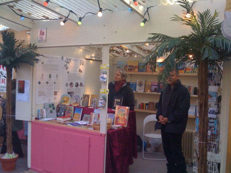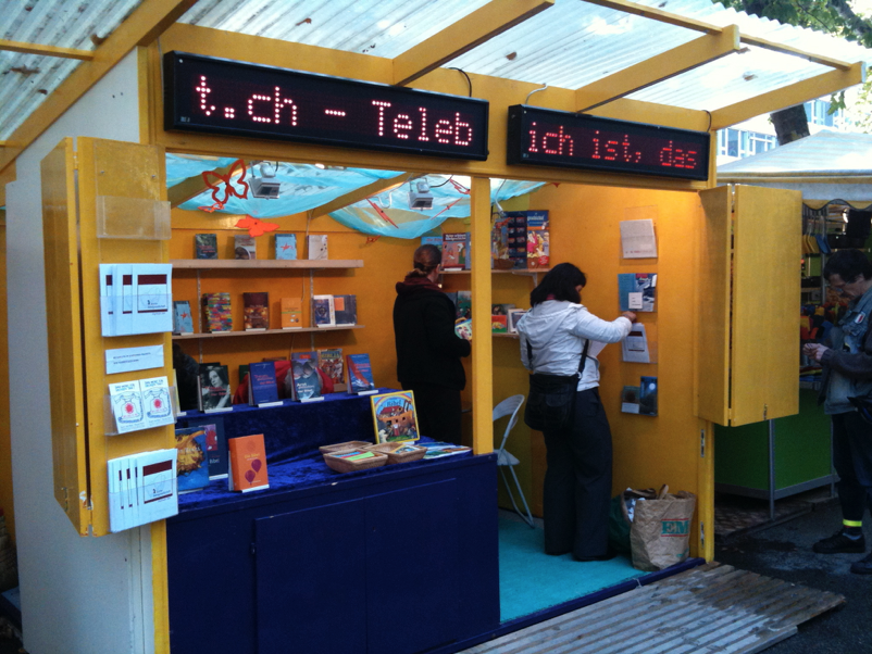 Das erste mal etwas Technik mit der Leuchtschrift am Stand. Eine Freiwillige Mitarbeiterin hat den Stand neu gestrichen. Die Anzahl der Bücher wurden reduziert.