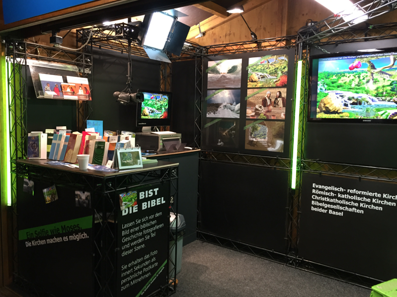 Der Stand wurde nochmal umgebaut und so konzipiert, dass er einfacher auf- und abbebaut und vorallem gelagert werden kann. Mehr raum entsteht und die Bibelgeschichten mit den Videostationen, die Telebibel und die Selfies gut zur geltung kommen.